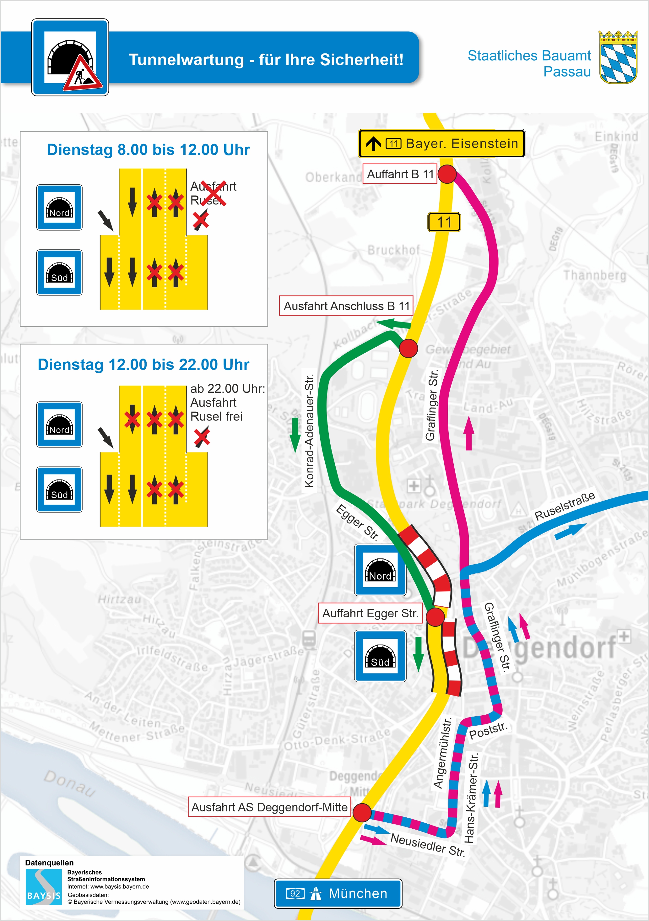Umleitung: Deggendorf Mitte, Hans-Krämer-Straße, Angermühlstraße, Poststraße, Graflinger Straße und Ruselstraße in Richtung Rusel bzw. Graflinger Straße und B 11 nach Bayerisch Eisenstein