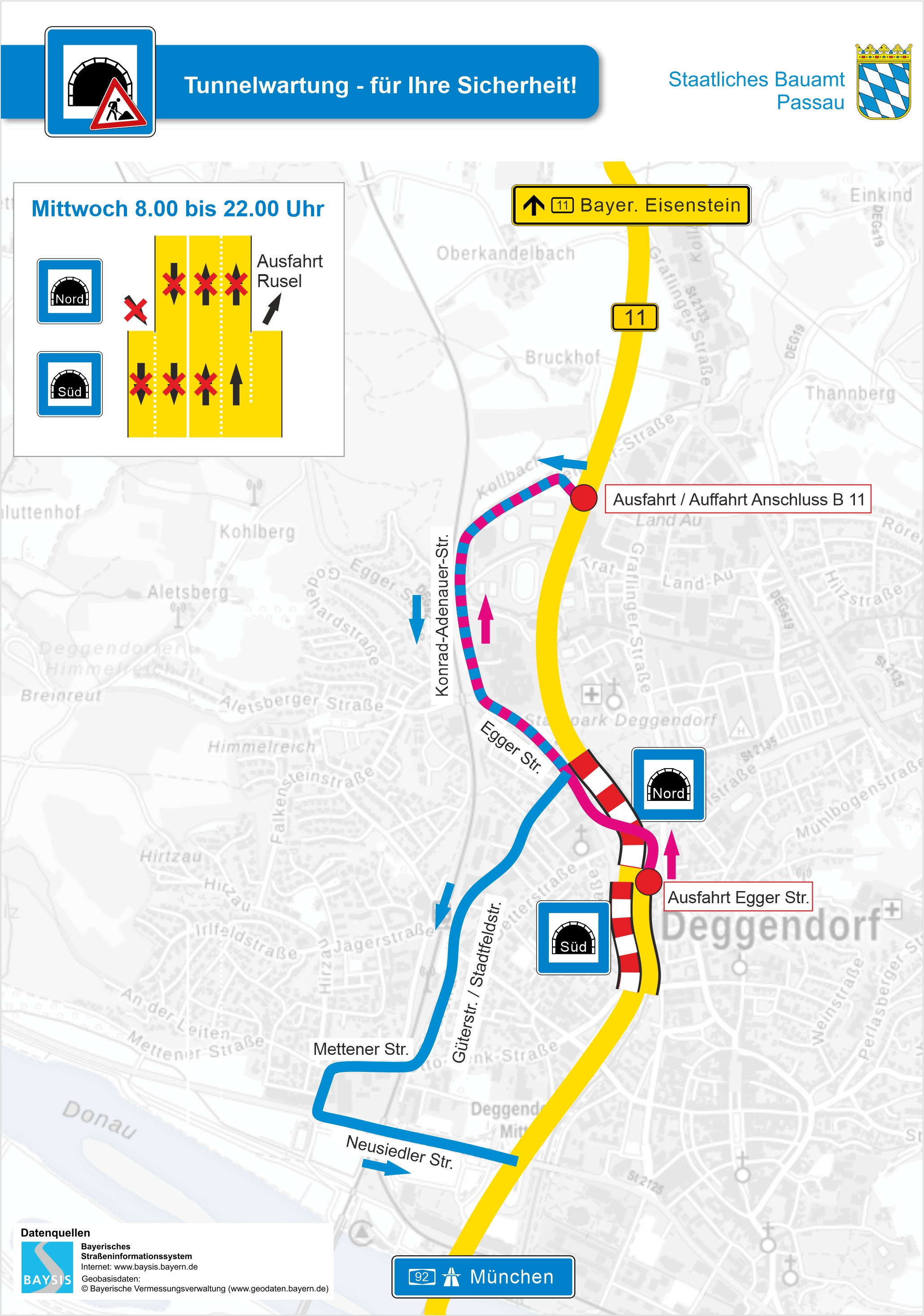 Umleitung: Anschluss B 11, Konrad-Adenauer-Straße, Egger Straße, Stadtfeldstraße, Güterstraße, Mettener Straße, Neusiedler Straße, Deggendorf Mitte