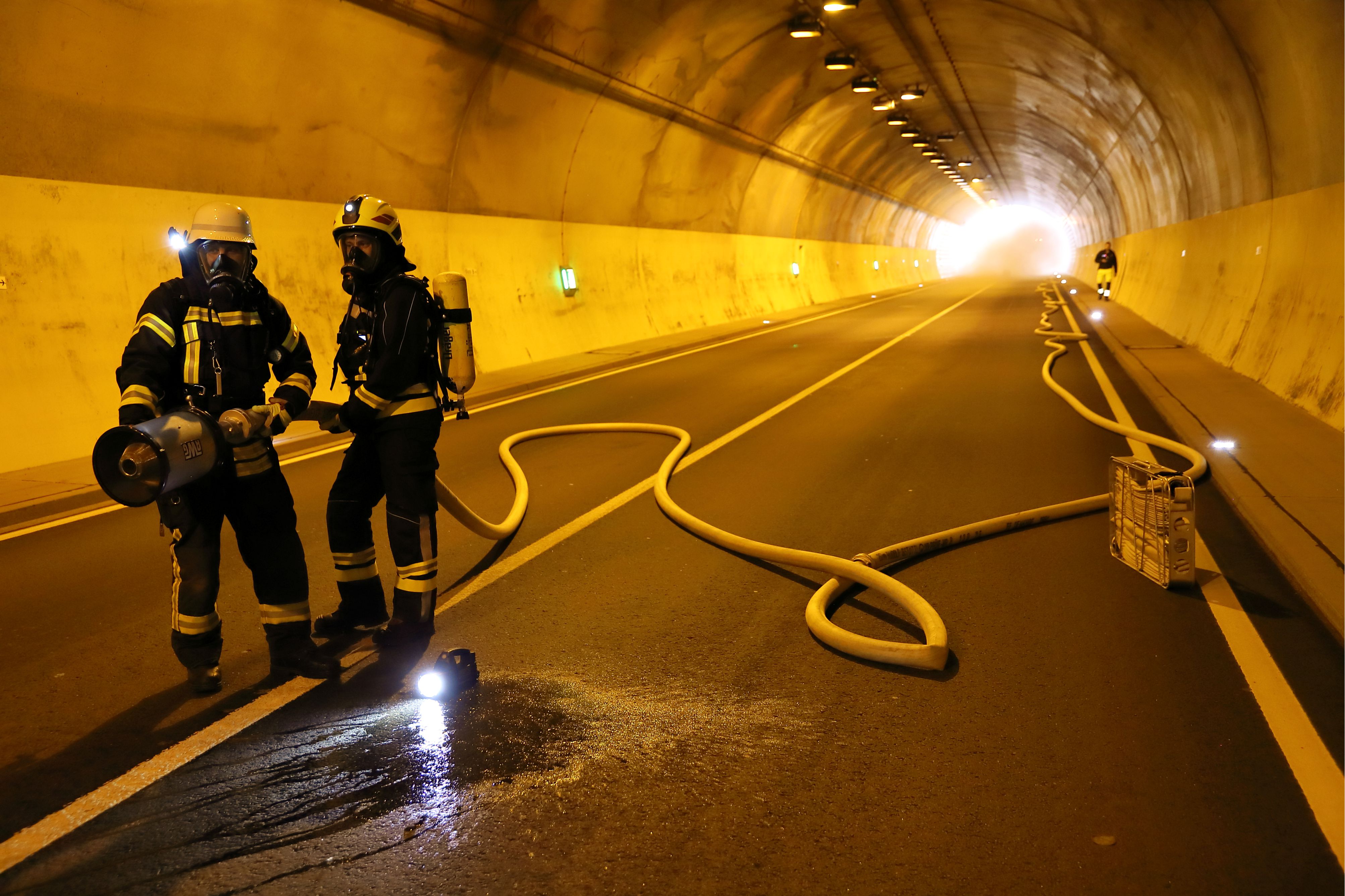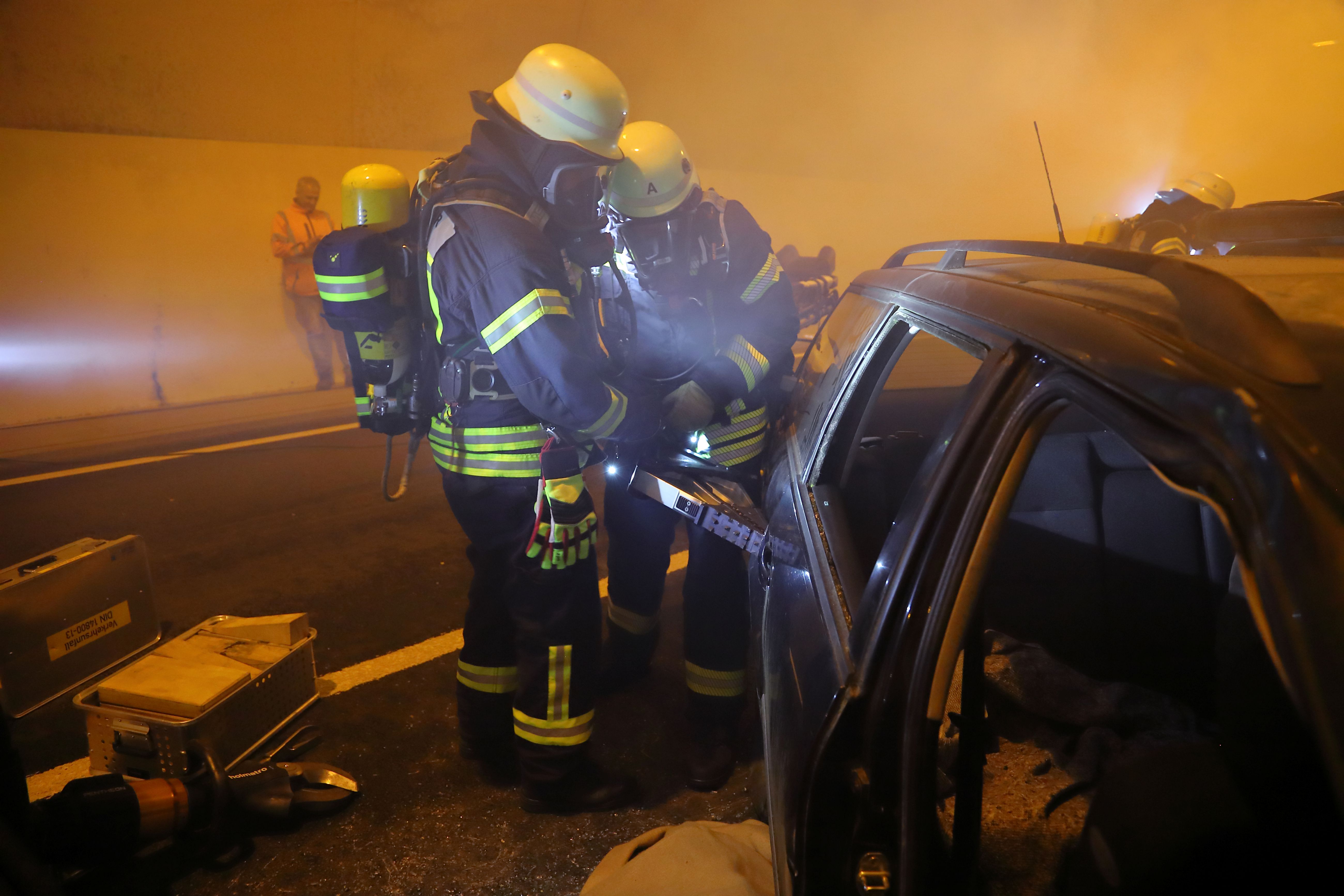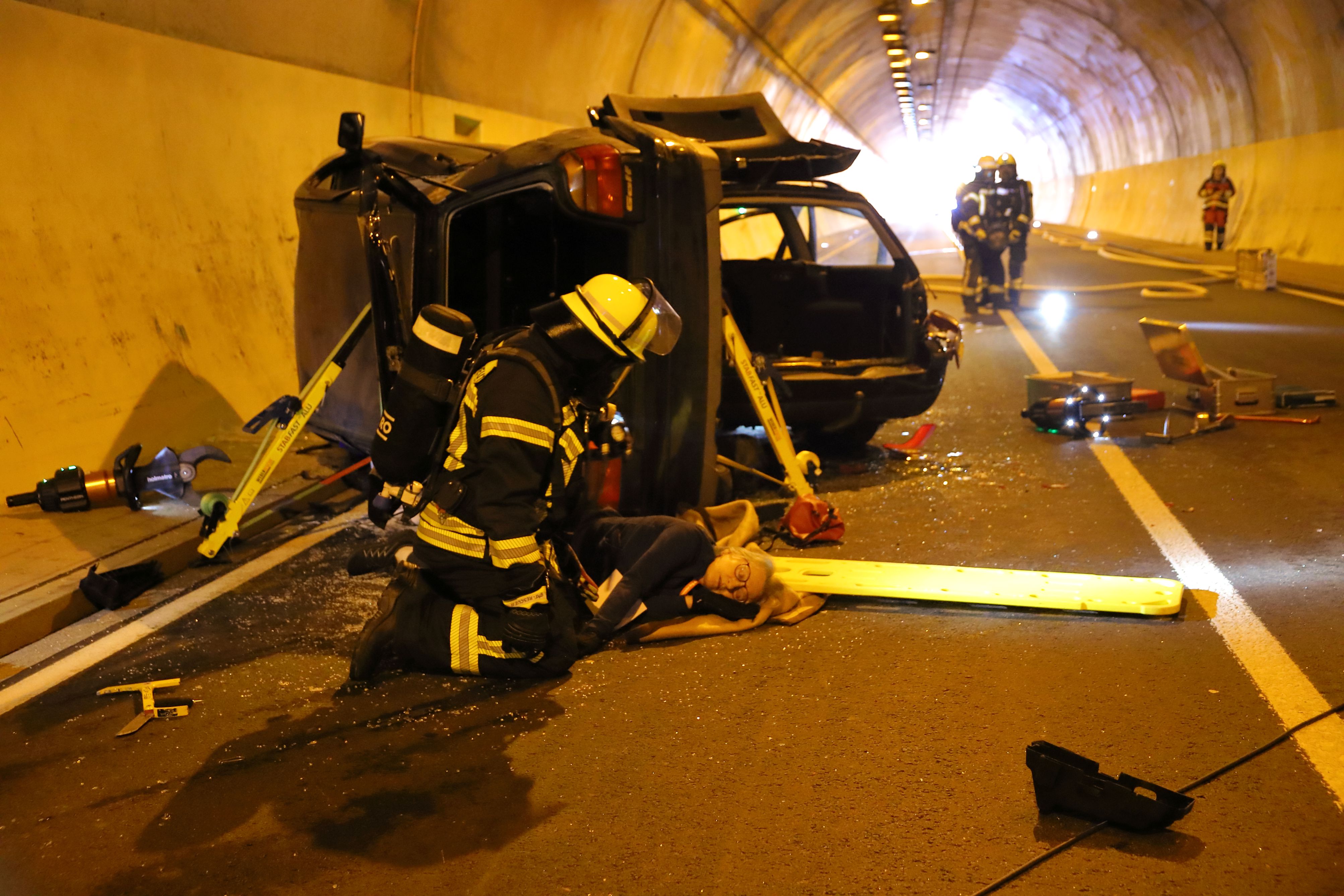 übung2: Mitten im Tunnel waren die beiden Fahrzeuge zusammengestoßen. Die Einsatzkräfte der Feuerwehren befreiten die Verletzten und brachten sie zur medizinischen Versorgung ins Freie.