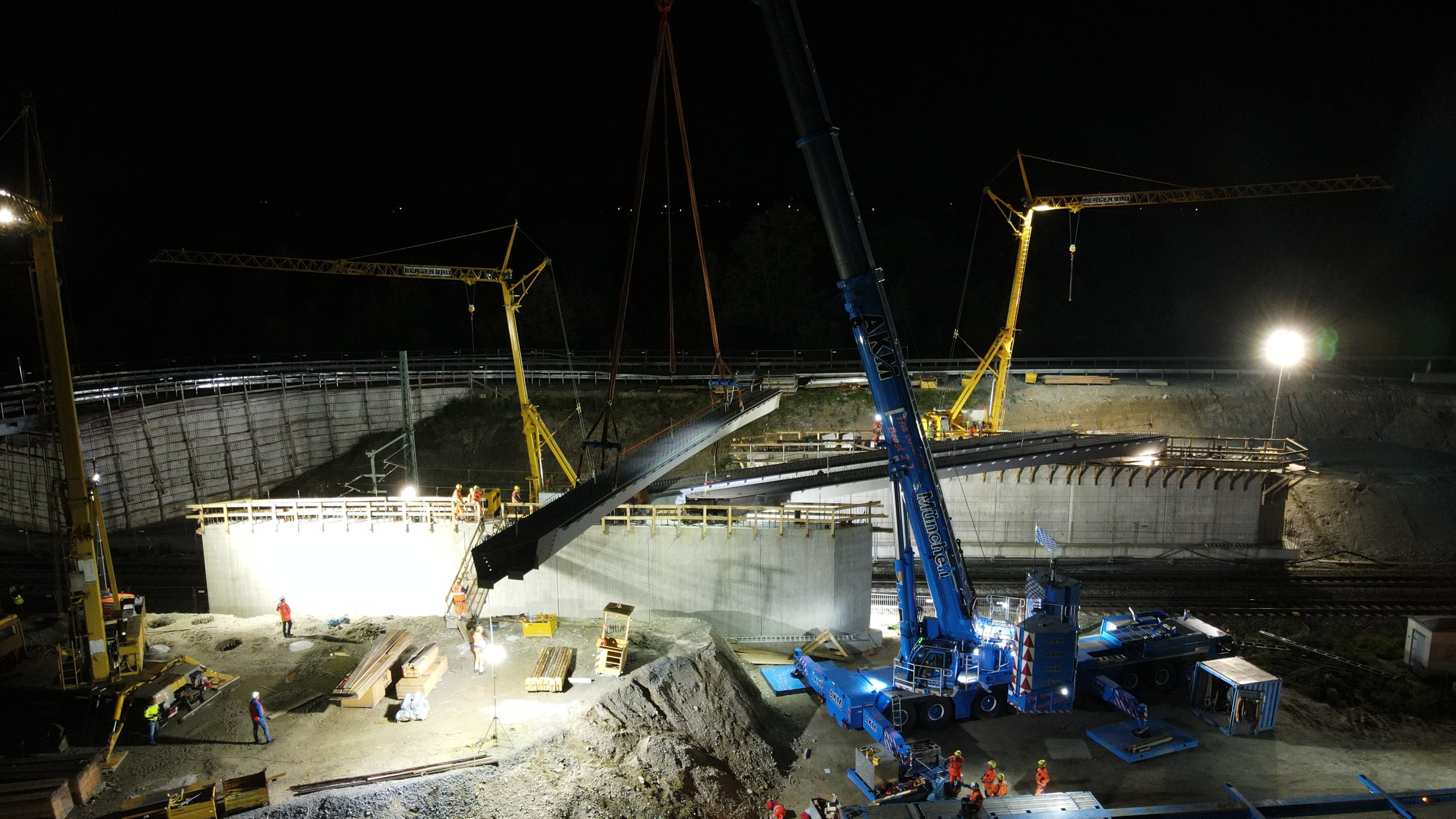 Ab Freitagabend wurden die sechs Stahlhohlträger per Schwertransport auf die Baustelle angeliefert. Im Bereich der Baustelle wurde die B 8 halbseitig gesperrt, um ausreichend Lager- und Aufstellfläche zu schaffen. Am Samstag ab 21 Uhr wurde die Bahnstrecke gesperrt, dann kam ein 500-Tonnen-Autokran zum Einsatz: Nacheinander wurden die je 31 Meter langen und 40 Tonnen schweren Träger auf die beiden Pfeiler gehoben. Im Anschluss wurden die Filigranstahlbetondecken zwischen den Trägern platziert.
