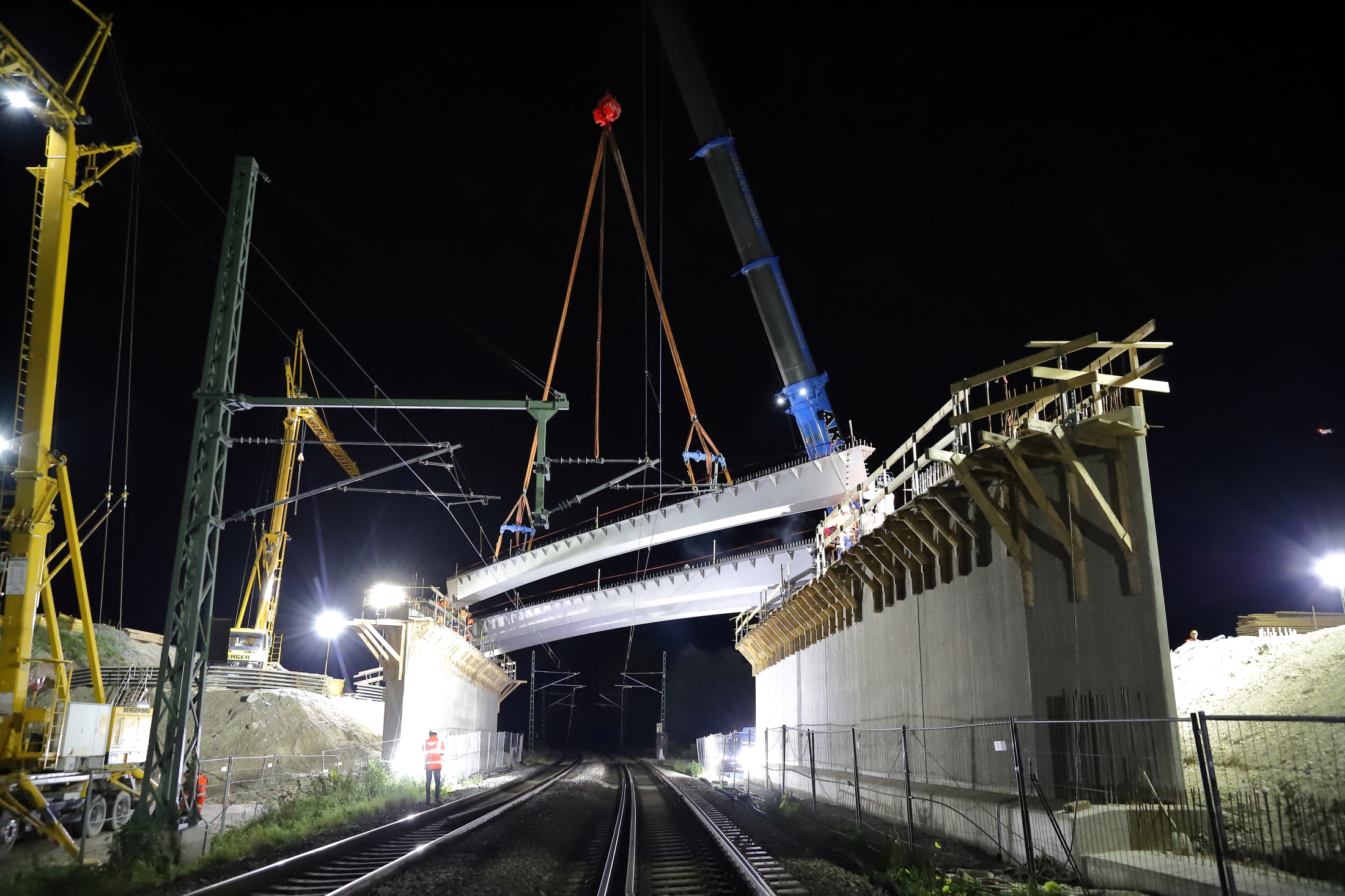 Die tonnenschwere Millimeterarbeit erforderte von den Kranführern und den weiteren Arbeitern höchste Präzision. Und das in einem engen Zeitfenster: Jeweils von 21 bis 5 Uhr war von Samstag auf Sonntag und von Sonntag auf Montag war die Bahnstrecke gesperrt, so dass die Arbeiten rasch vorangehen mussten. Die Sperrpausen waren mit der Deutschen Bahn bereits vor gut drei Jahren abgestimmt worden. Danach richtet sich der zeitliche Ablauf der Baumaßnahme, die einzelnen Arbeiten müssen genau eingetaktet werden.
