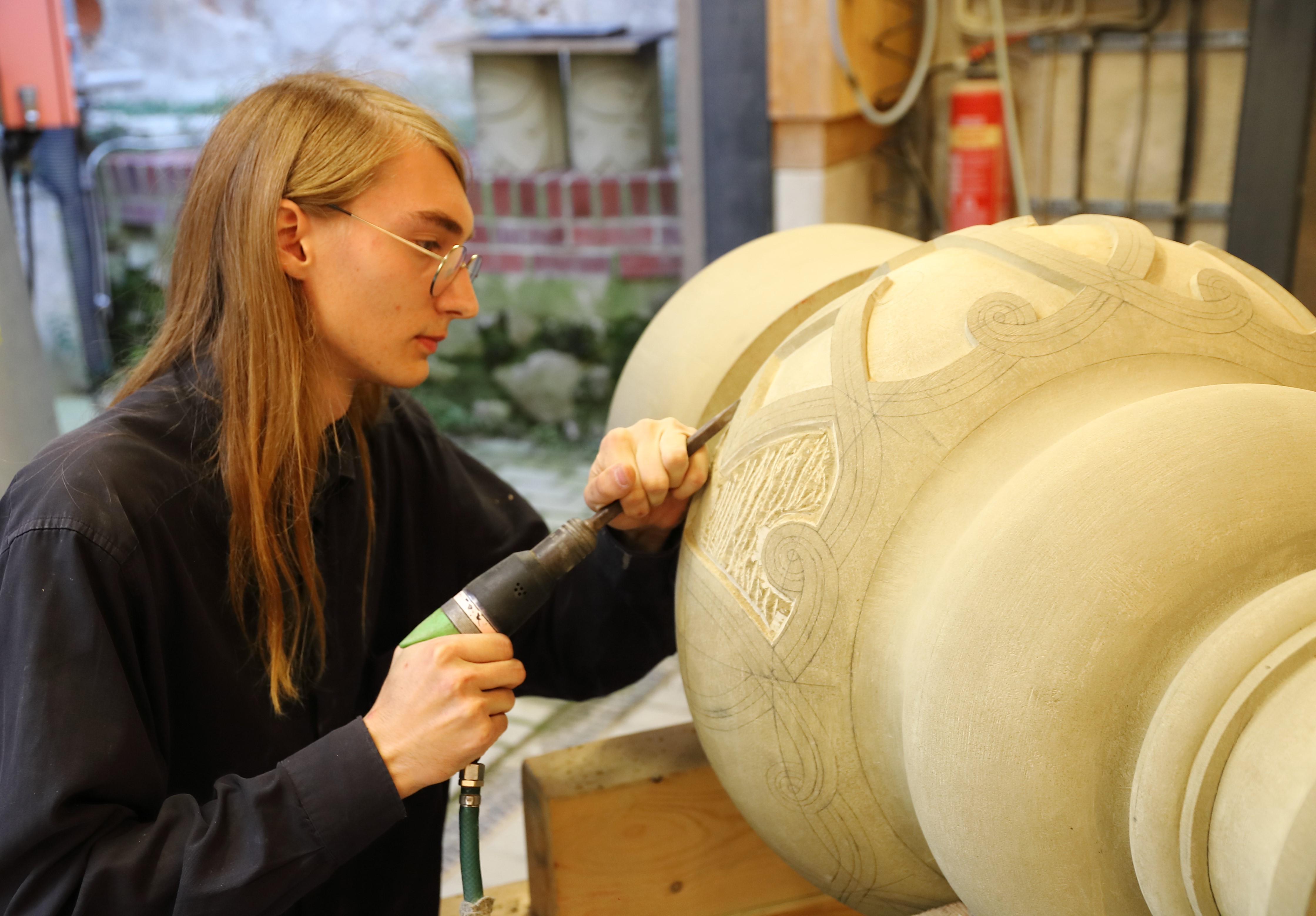 kammersieger1: Jonas Höhn bei der Arbeit in der Werkstatt der Dombauhütte. © Staatliches Bauamt Passau / Zahn