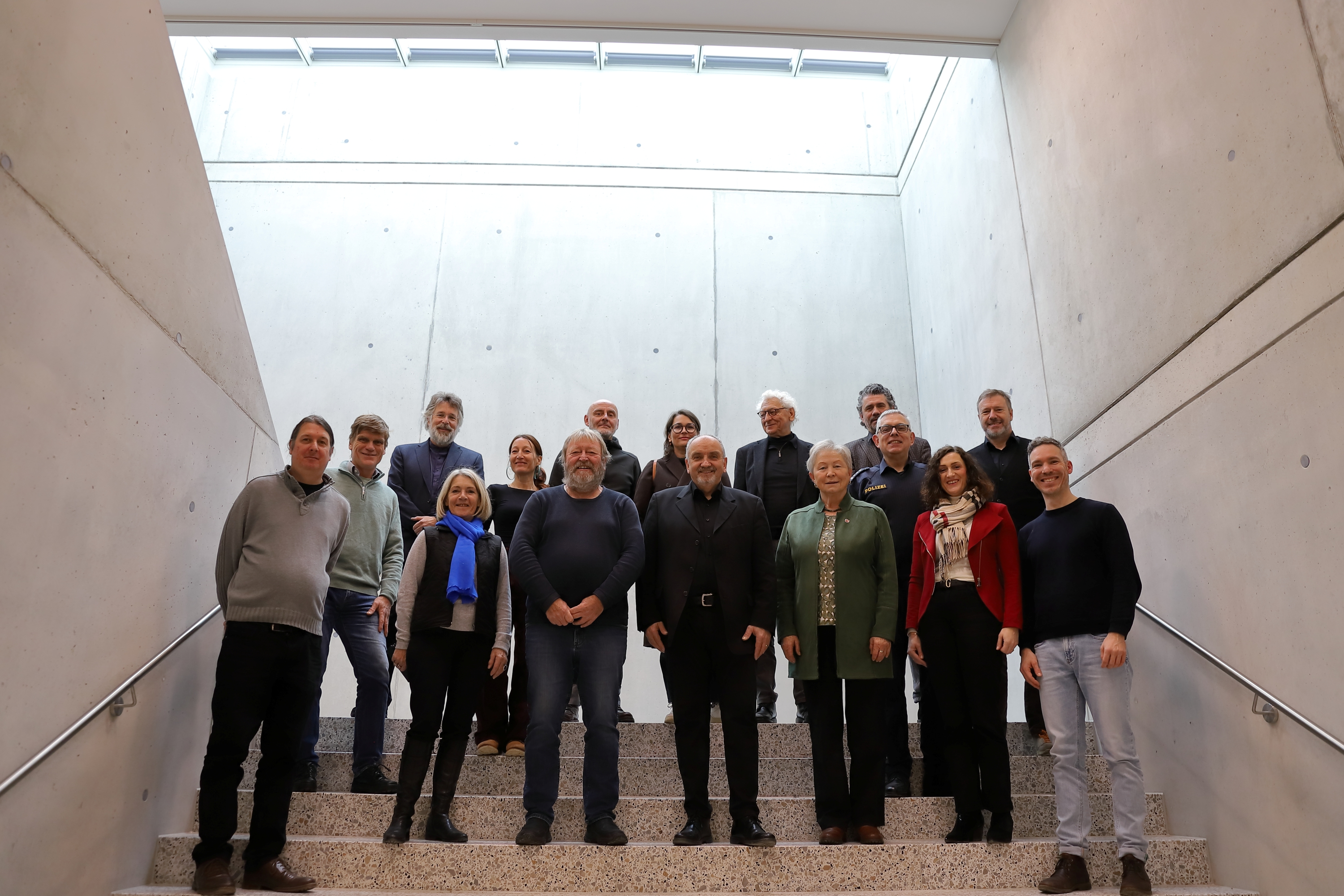 Das Treppenhaus im neuen Dienstgebäude der PI Simbach lädt geradezu zur künstlerischen Gestaltung ein. Ltd. Baudirektor Norbert Sterl (vorne, 4.v.r.), 3. Bürgermeisterin Christa Kick (vorne, 3.v.r.) und Erster Polizeihauptkommissar Michael Diem (2. Reihe) freuten sich über das Interesse der Künstler, die zum Kunst-am-Bau-Kolloquium mit dem Gutachtergremium gekommen waren.