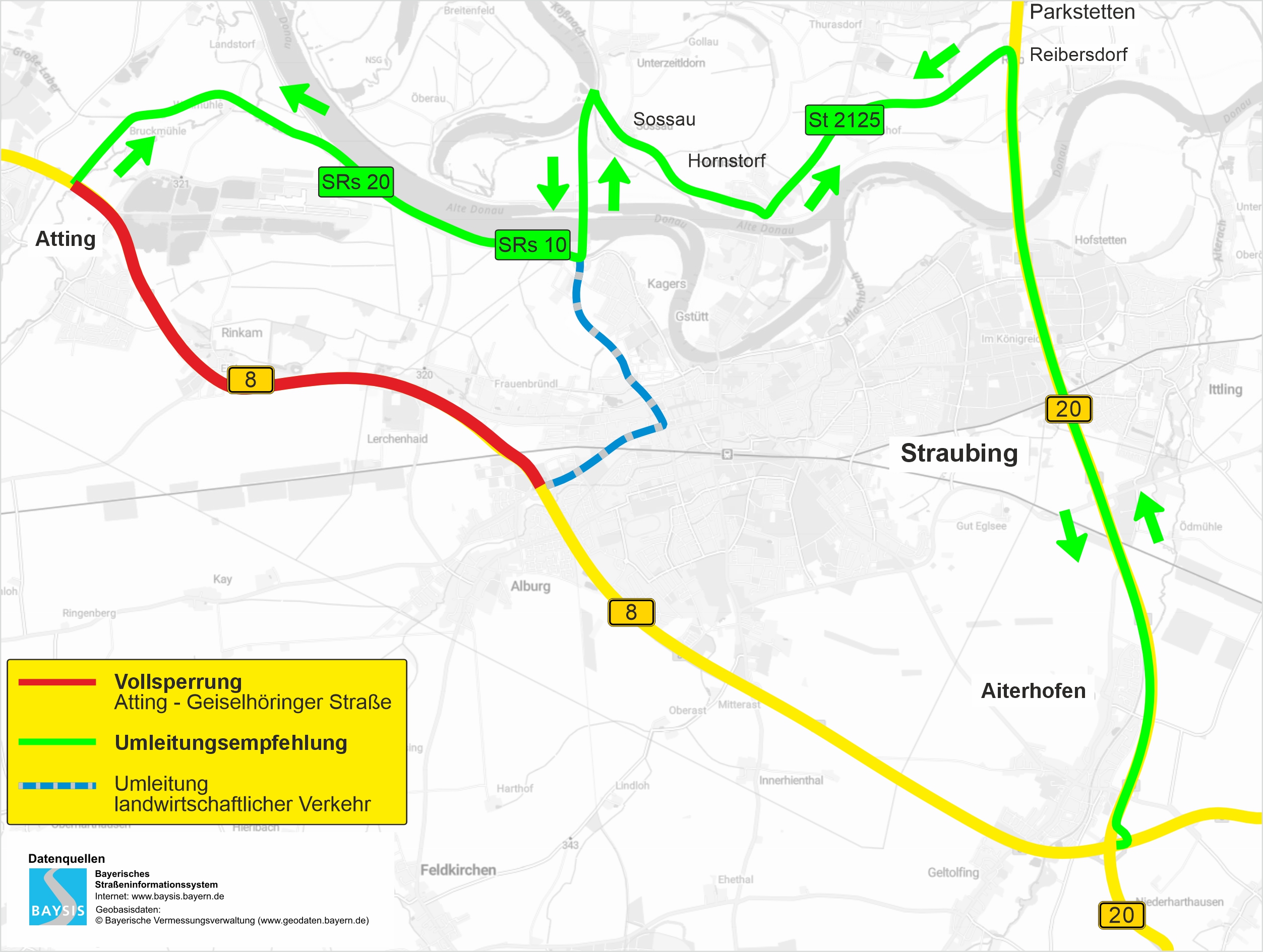 Von Plattling kommend ist die Abfahrt an der Geiselhöringer Straße in Straubing über die Bauzeit noch möglich. Die Kreisstraße SRs21 von Alburg nach Lerchenhaid wird aber für den Durchgangsverkehr gesperrt, da diese Straße nicht geeignet ist, den Umleitungsverkehr aufzunehmen. Die Zufahrt zum Bezirkskrankenhaus Lerchenhaid und zur Fischzucht Mayer bleibt jederzeit – auch für eine geplante Großveranstaltung in der Baustellenzeit – von der Kreisstraße aus möglich.